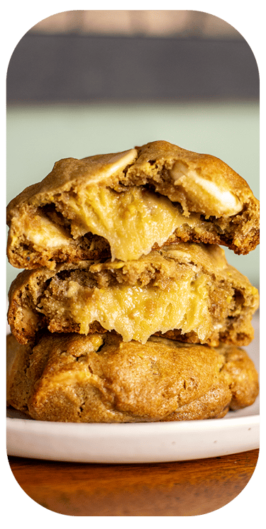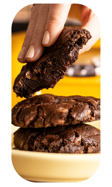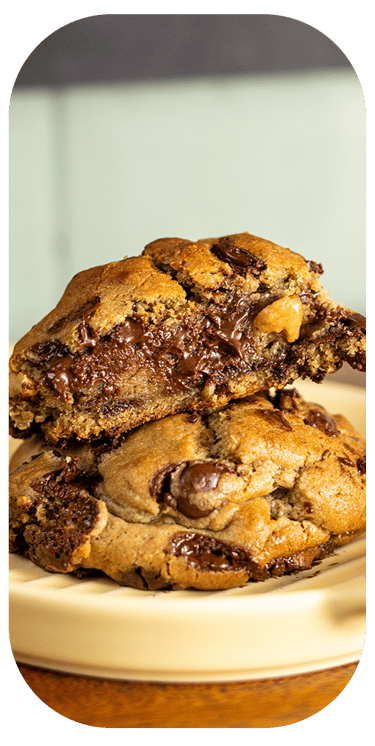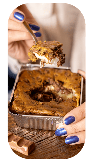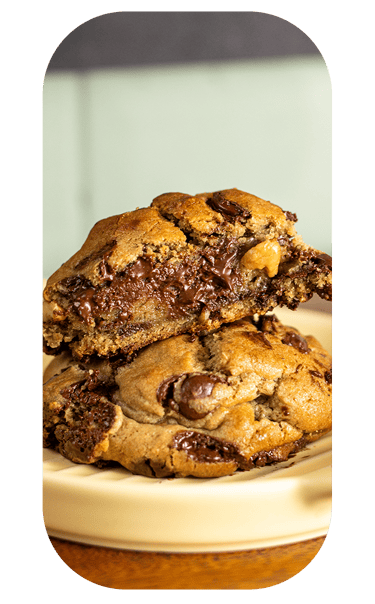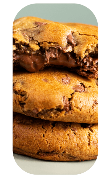 O tradicional cookie com massa de baunilha e pedaços de chocolate nobre e nozes.