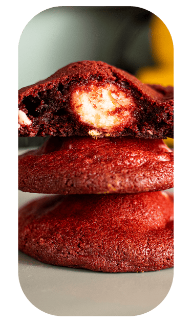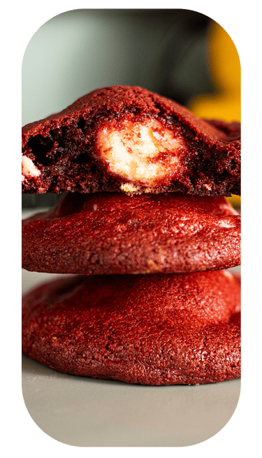 Massa de Red Velvet com gotas de chocolate branco, recheado com muito brigadeiro de leite ninho.